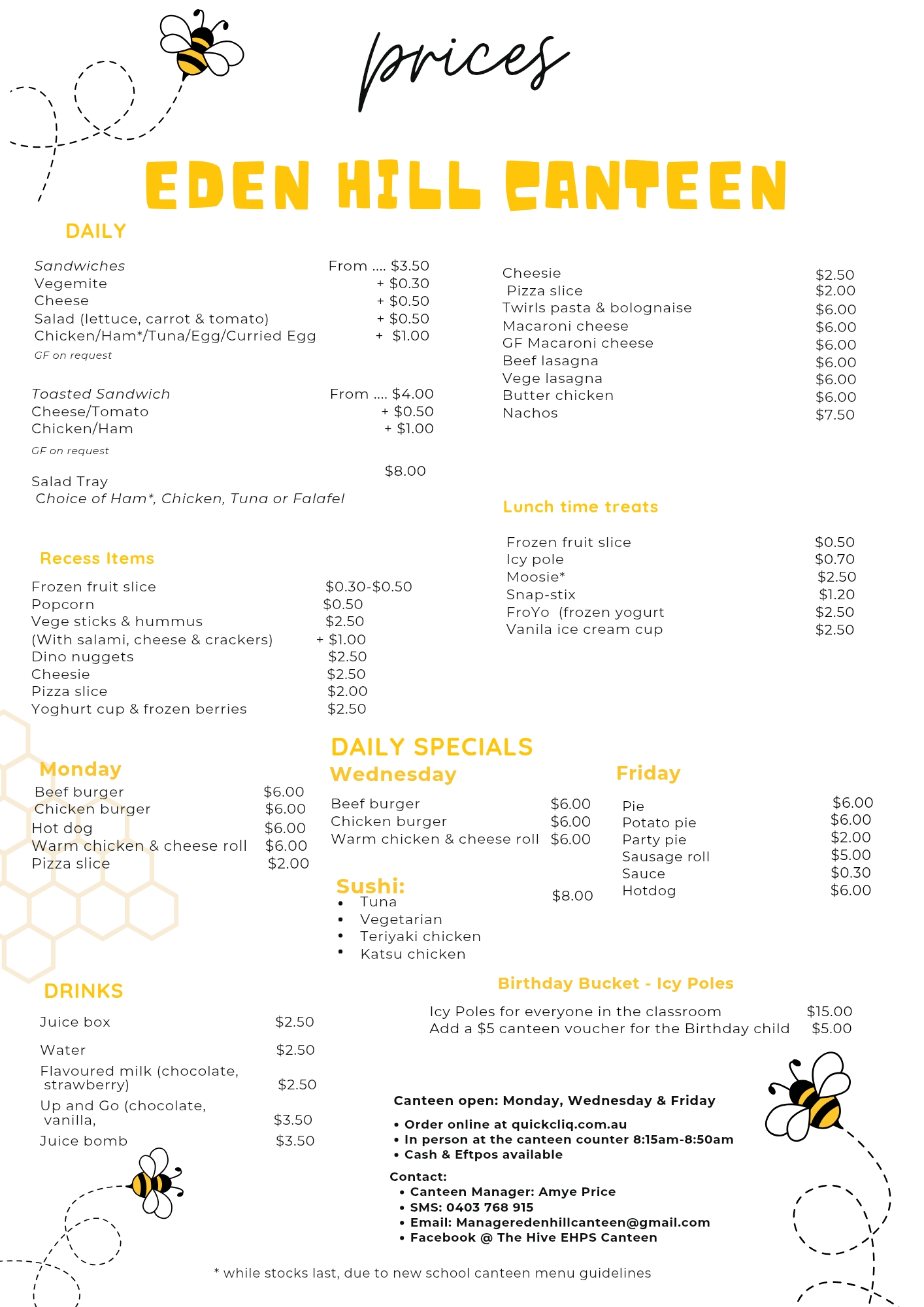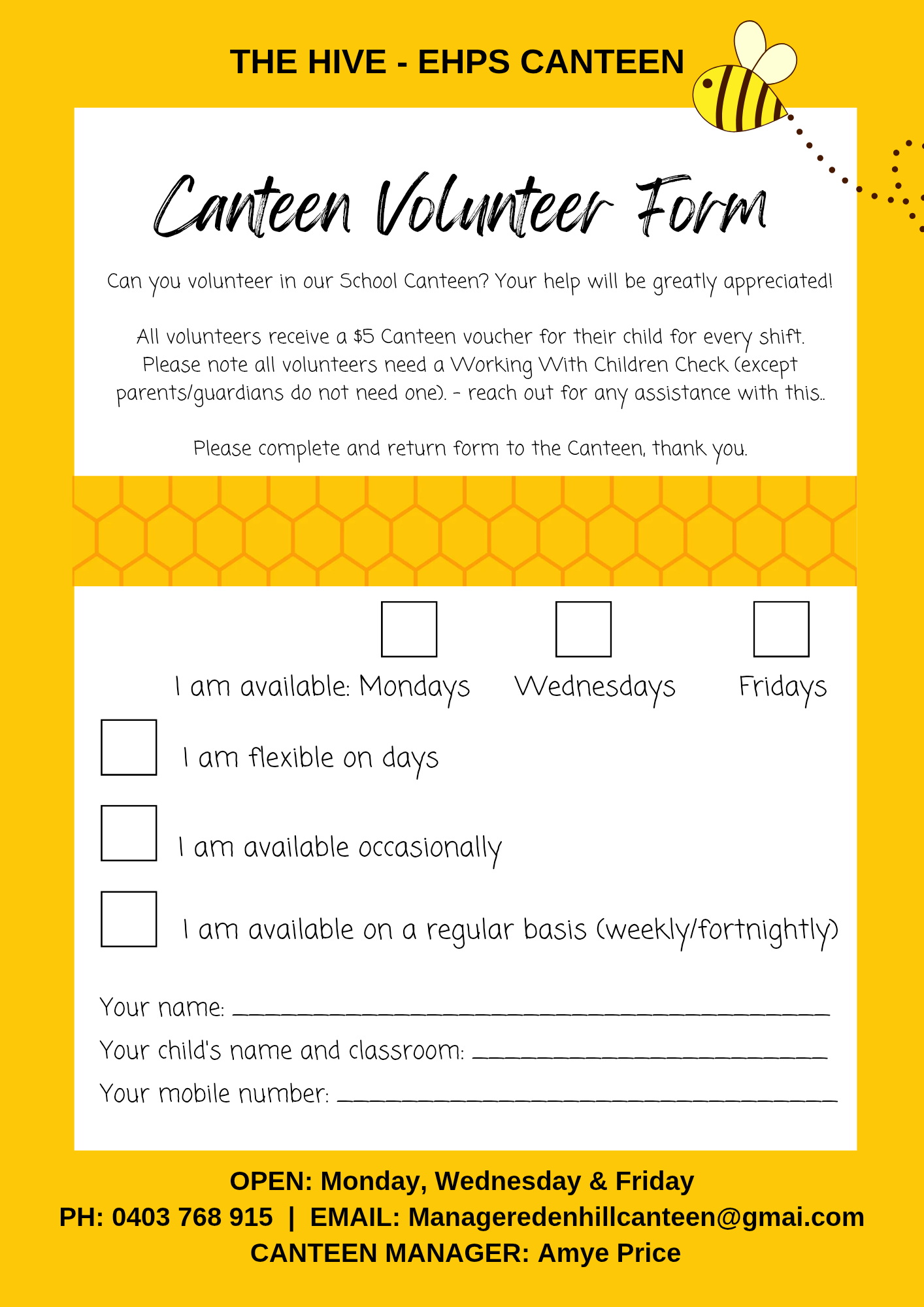 Our canteen, The Hive, is open each Monday, Wednesday & Friday